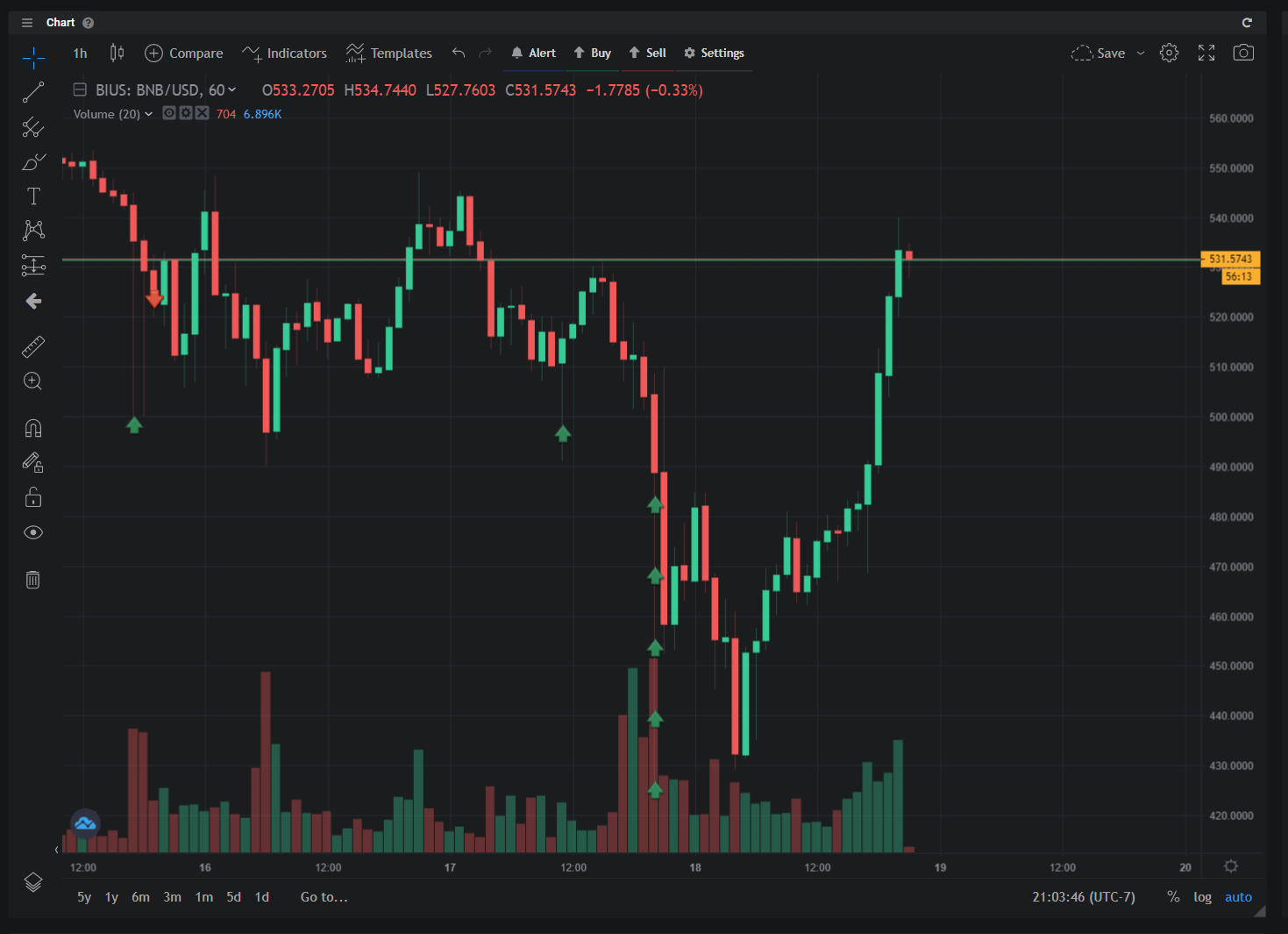 Once it hit the preset for dropping back down, ALTRADY SOFTWAREautomaticaly placed my sell order for me. So this was a quick 2 hour scalp. (Green Arrows are buys and Red Arrows are sales). You can see when it hit the ladder we had placed deeper, we didn't have any sales orders because we wanted to swing trade this, and hold it for a longer period of time. All seven orders hit wicks, and all seven put us in immediate profit, even on the hour that they were purchased. That's the power of the buy ladders.